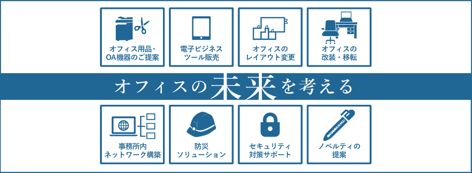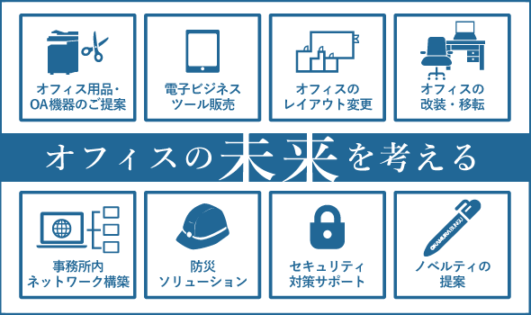オフィスをもっと機能的にするためのオフィス用品・PC、OA機器のご提案、電子サインや大型ディスプレイといった電子ビジネスツールの販売や、オフィスのレイアウト変更などを実施。